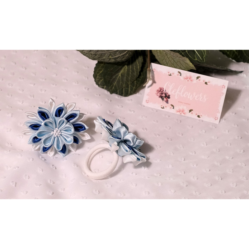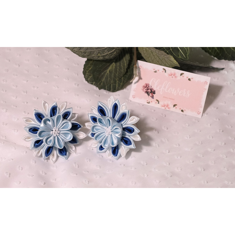 Matu gumijas izgatavotas no satīna lentes, izmantojot kanzashi tehniku.