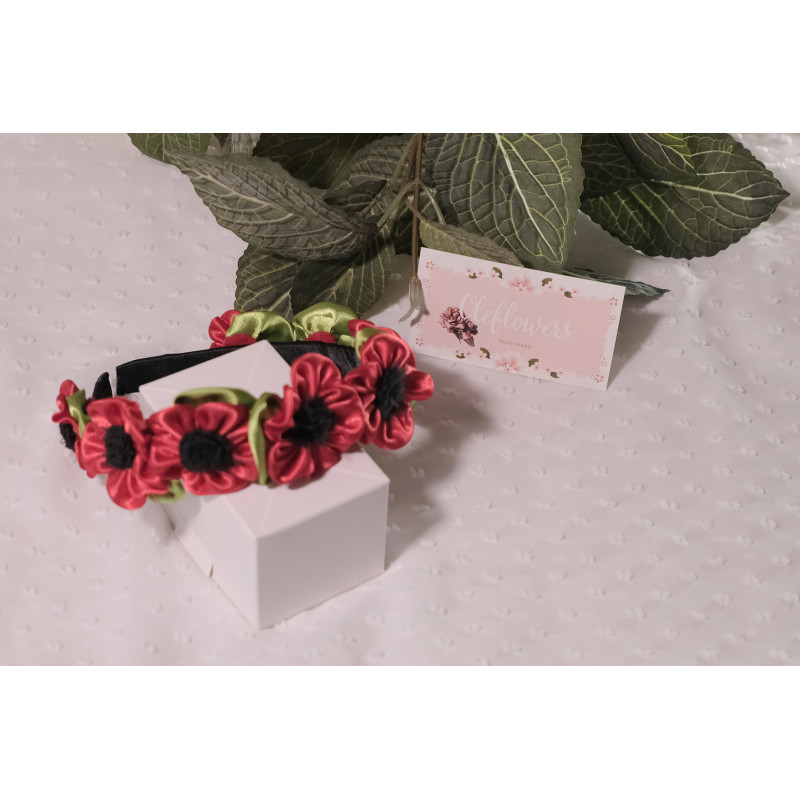 Matu aksesuāri izgatavoti no satīna lentes, izmantojot kanzashi tehniku.