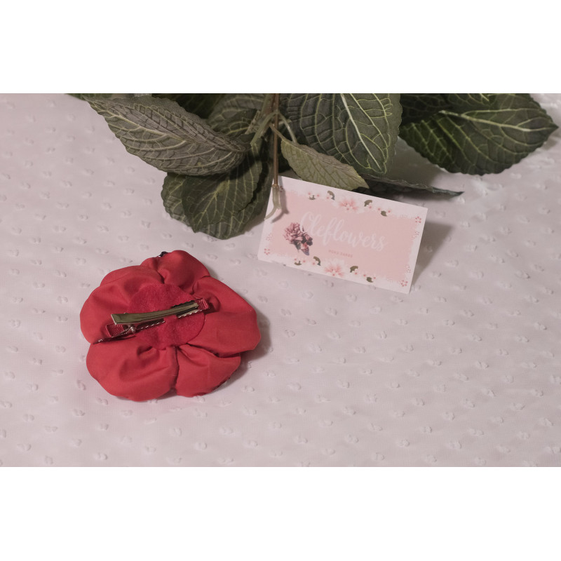 Matu aksesuārs izgatavots no satīna lentes un auduma, izmantojot kanzashi tehniku.