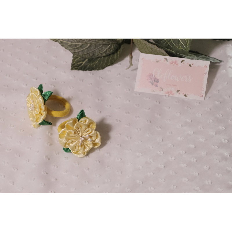 Matu gumijas izgatavotas no satīna lentes, izmantojot kanzashi tehniku.