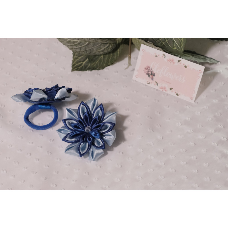 Matu gumijas izgatavotas no satīna lentes, izmantojot kanzashi tehniku.
